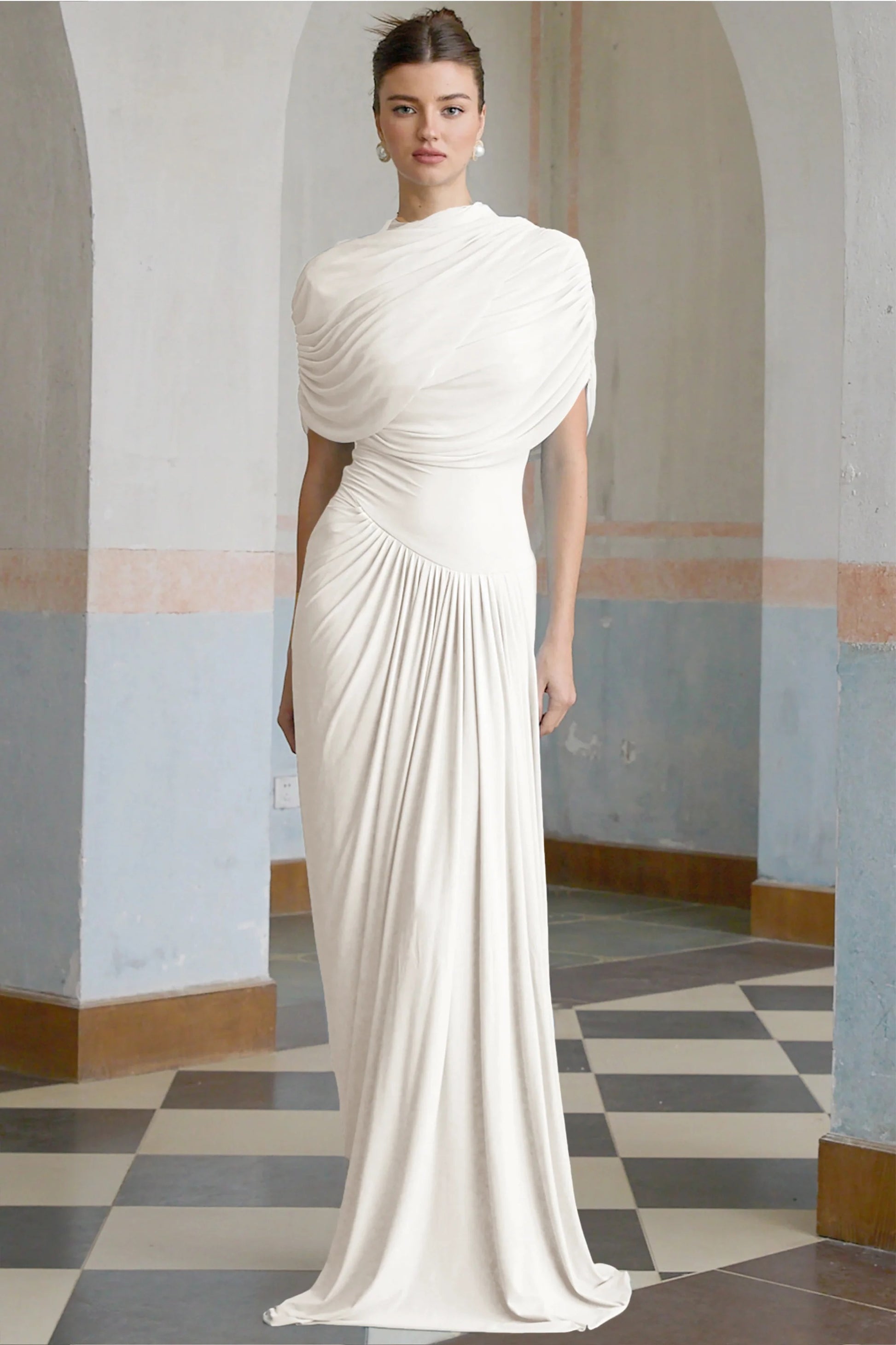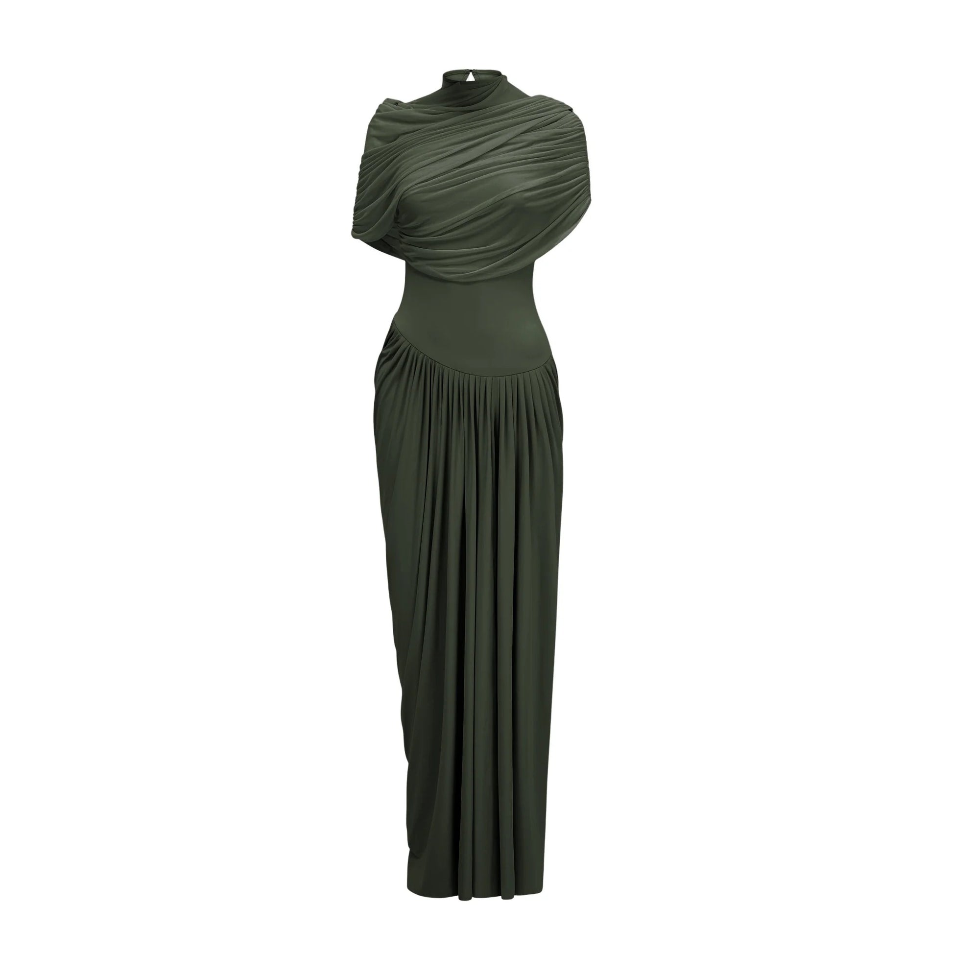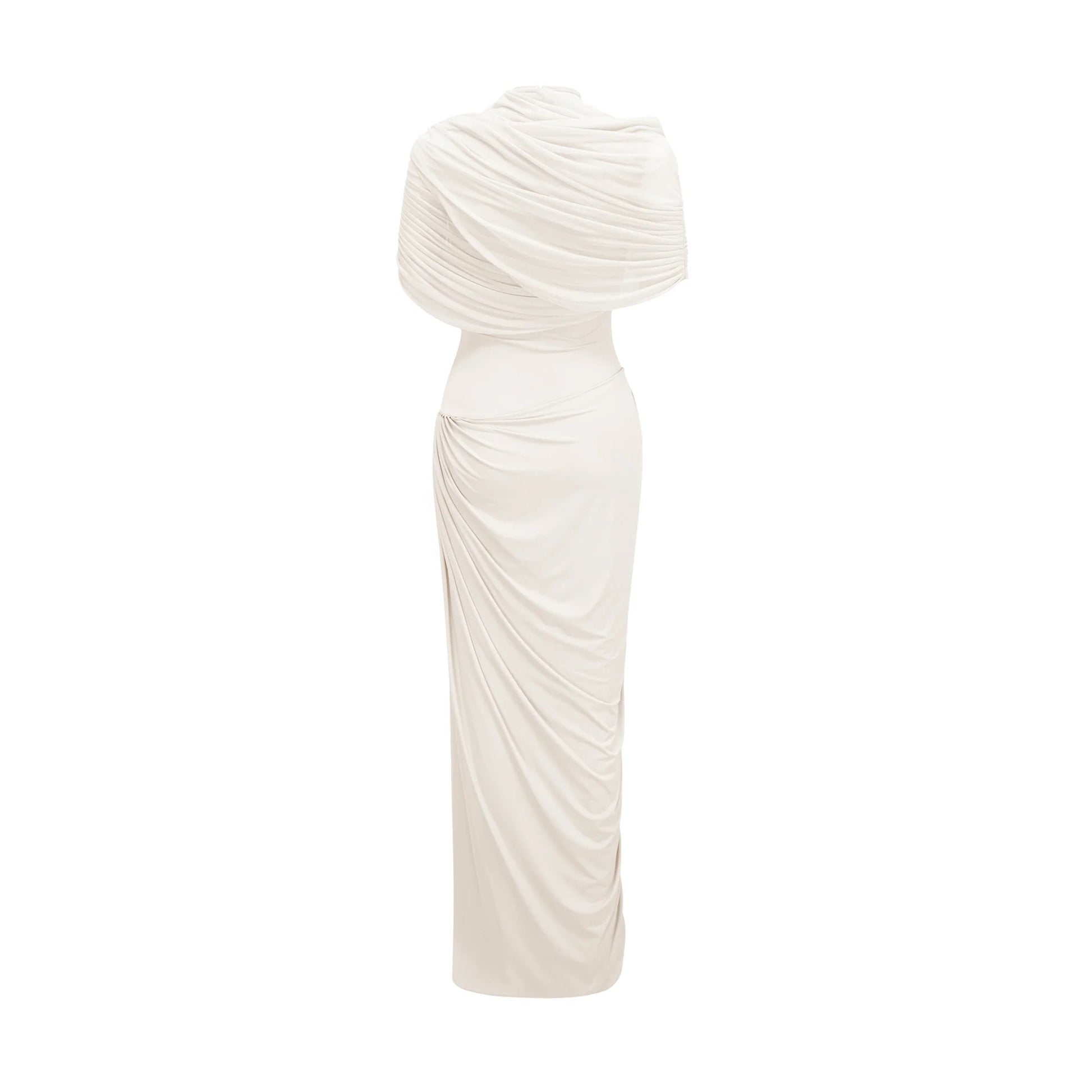 El vestido Aveline redefine la feminidad a través de un diseño asimétrico y drapeado que envuelve el cuerpo con suavidad y precisión. Su caída fluida y plisados delicados crean movimiento y ligereza, mientras el tono azul cielo aporta un aire sofisticado y luminoso.